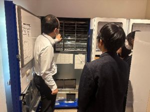 エム・ピー・ソリューションが長年にわたり決済サービスを提供している飲料自販機の中がどのような仕組みになっているのか、実際に自販機の中を見ながら解説を行いました。生徒は、「身近にある自販機の中を初めて見ることができ、仕組みを知ることができて面白かった」「今後はこれまでとは違う視点で自販機を使うと思う」と、興味深い様子で見学していました。
