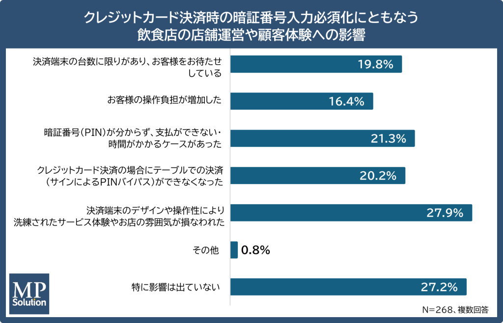 Q1. クレジットカード決済時の暗証番号入力必須化にともない、飲食店の店舗運営やお客様の体験にどのような影響が出ていますか。