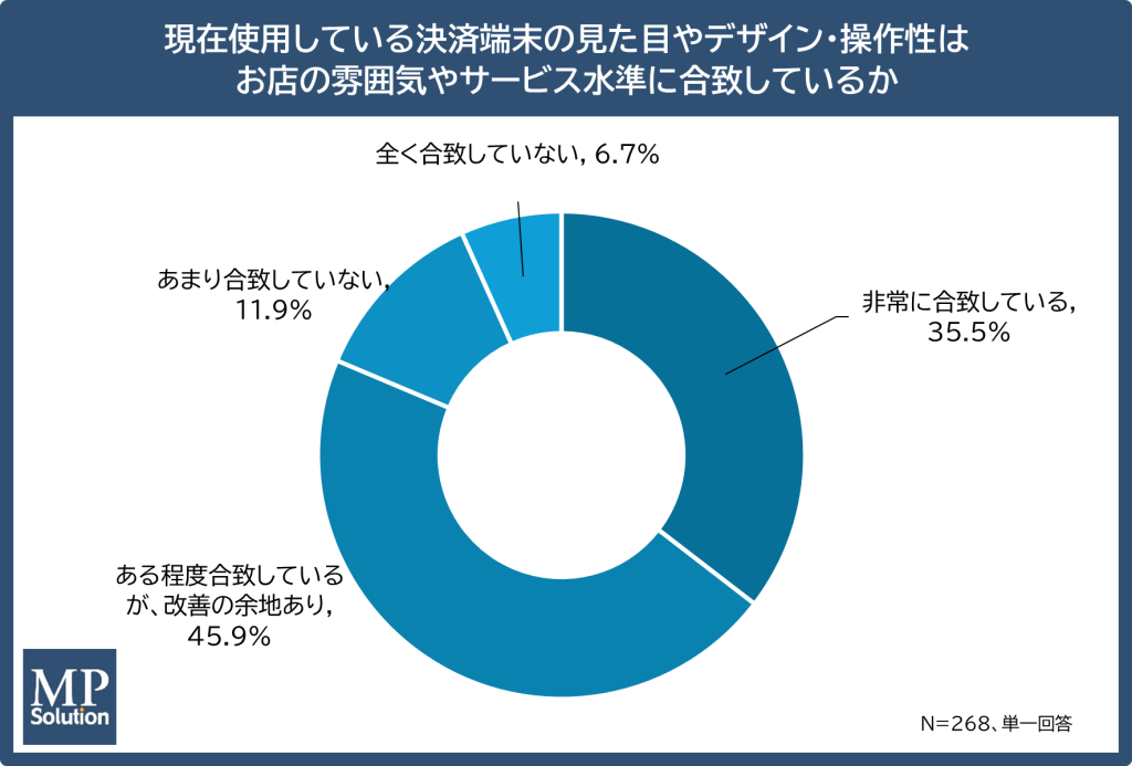 現在採用している決済端末について、見た目やデザイン・操作性がお店の雰囲気やサービス水準に合致しているかと質問したところ、「改善の余地がある・合致していない」と回答した人が64.6%にものぼることが判明しました。